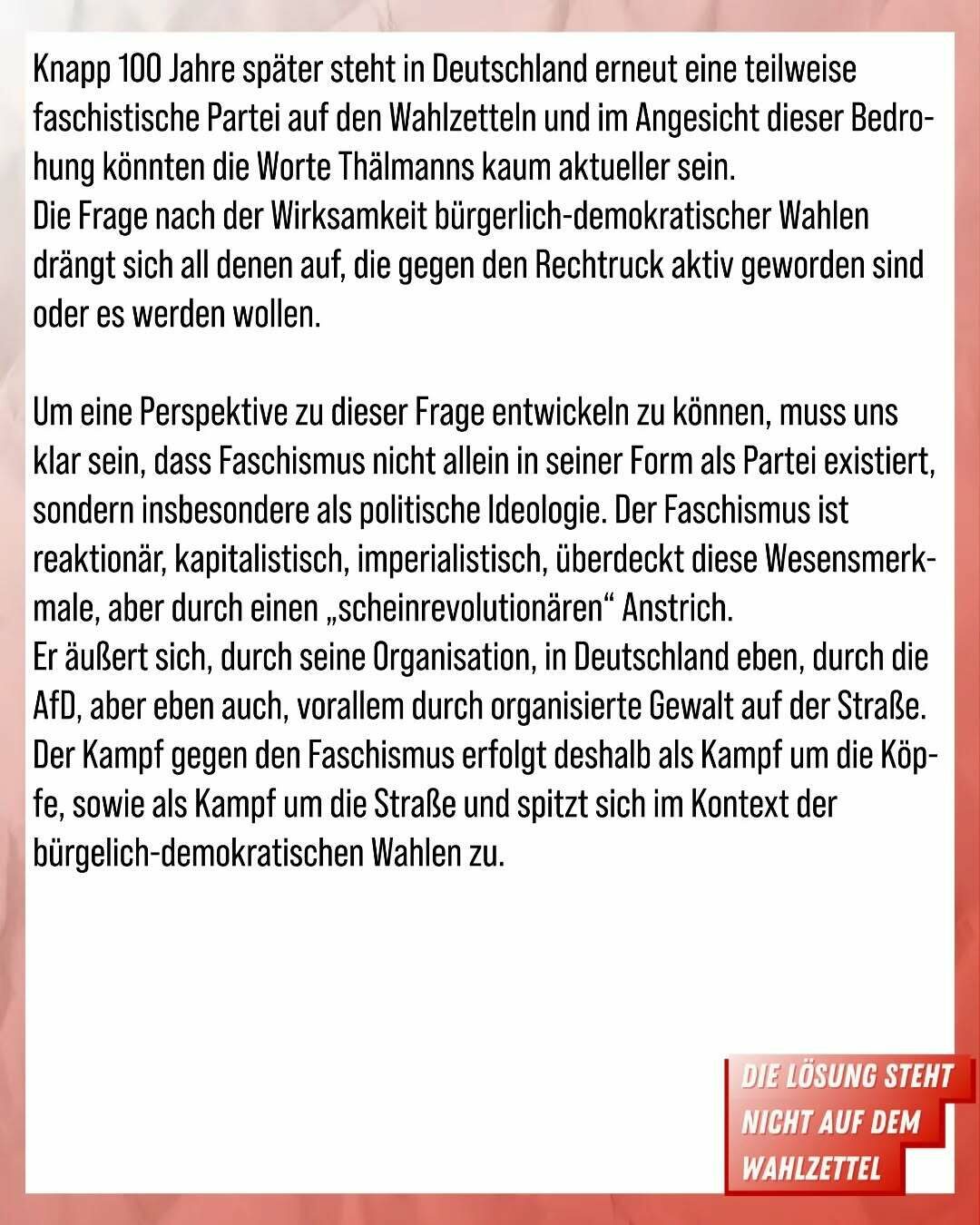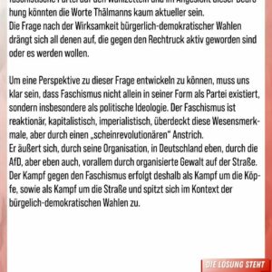 Knapp 100 Jahre später steht in Deutschland erneut eine teilweise faschistische Partei auf den Wahlzetteln und im Angesicht dieser Bedrohung könnten die Worte Thälmanns kaum aktueller sein.