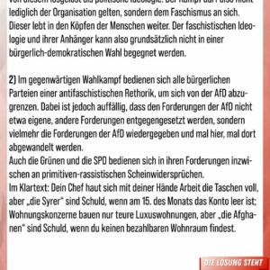 2) Im gegenwärtigen Wahlkampf bedienen sich alle bürgerlichen Parteien einer antifaschistischen Rethorik, um sich von der AfD abzu- grenzen. Dabei ist jedoch auffällig, dass den Forderungen der AfD nicht etwa eigene, andere Forderungen entgegengesetzt werden, sondern vielmehr die Forderungen der AfD wiedergegeben und mal hier, mal dort abgewandelt werden.