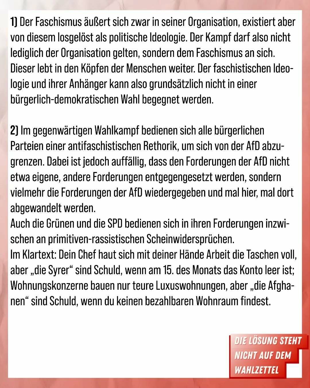 1) Der Faschismus äußert sich zwar in seiner Organisation, existiert aber von diesem losgelöst als politische Ideologie. Der Kampf darf also nicht lediglich der Organisation gelten, sondern dem Faschismus an sich. Dieser lebt in den Köpfen der Menschen weiter. Der faschistischen Ideologie und ihrer Anhänger kann also grundsätzlich nicht in einer bürgerlich-demokratischen Wahl begegnet werden.
