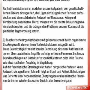 Diese Gewalttätigkeit reicht von der Bedrohung einzelner Antifaschist:innen über rassistische Angriffe auf migrantische Personen, bis hin zu Brandanschlägen auf Unterkünfte von Geflüchteten oder linke Räume, wie etwa nach dem Anschlag in Magdeburg.