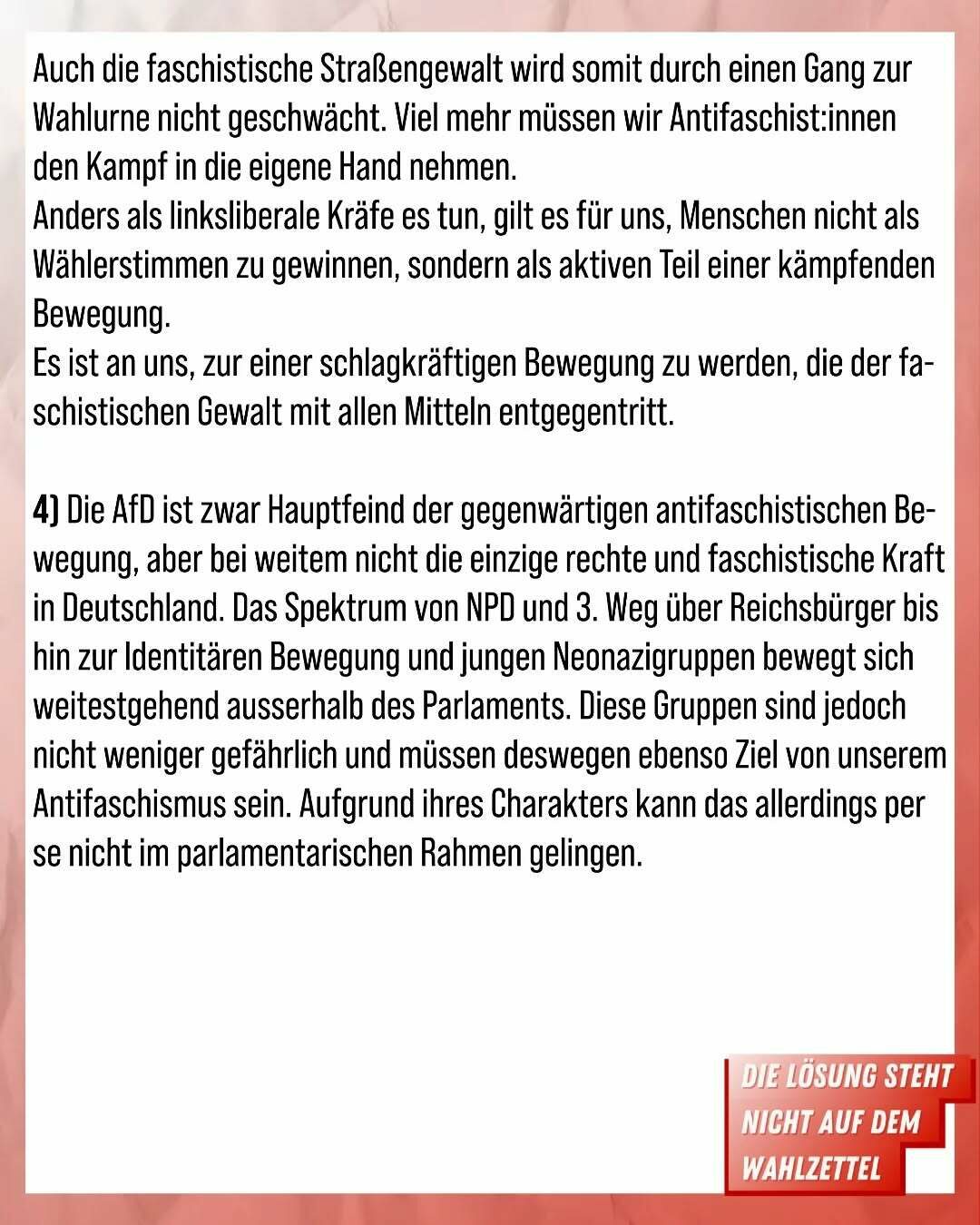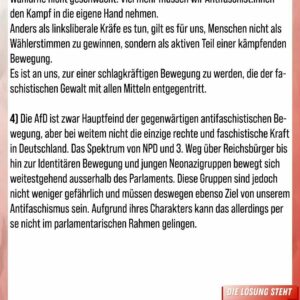 4) Die AfD ist zwar Hauptfeind der gegenwärtigen antifaschistischen Bewegung, aber bei weitem nicht die einzige rechte und faschistische Kraft in Deutschland. Das Spektrum von NPD und 3. Weg über Reichsbürger bis hin zur Identitären Bewegung und jungen Neonazigruppen bewegt sich weitestgehend ausserhalb des Parlaments. Diese Gruppen sind jedoch nicht weniger gefährlich und müssen deswegen ebenso Ziel von unserem Antifaschismus sein. Aufgrund ihres Charakters kann das allerdings per se nicht im parlamentarischen Rahmen gelingen.