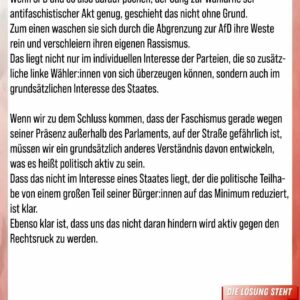 Als Antifaschist:innen ist es daher unsere Aufgabe in den gesellschaft- lichen Diskurs einzugreifen, die Lügen der bürgerlichen Parteien aufzudecken und eine solidarische Antwort auf Rassismus, Krieg und Verelendung anzubieten. Hierzu müssen wir die rechte Diskurshegemonie durchbrechen und die drängenden Probleme unserer Klasse auf die politische Tagesordnung setzen.