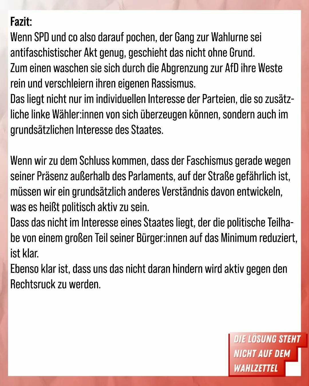 Deswegen wollen wir rund um die Wahl auch auf der Straße aktiv werden, haltet Augen und Ohren offen und lasst uns gemeinsam diesem System den Kampf ansagen!