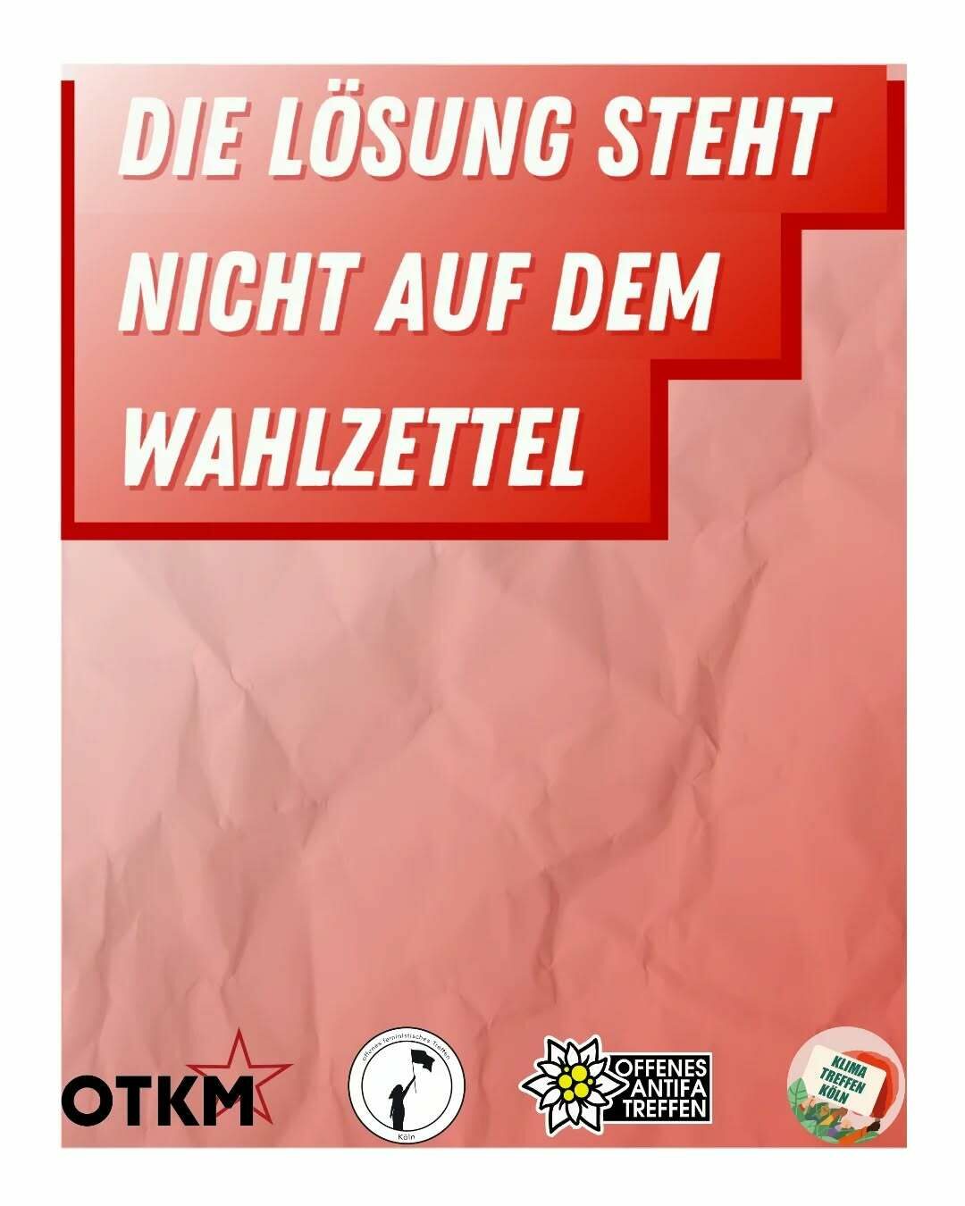 Anlässlich der Bundestagswahlen im Februar haben wir uns als Offene Treffen aus dem Linken Zentrum Köln zusammen getan. In den nächsten Tagen kommen verschiedene Beiträge in denen die Politik der Herrschenden entlarvt wird, außerdem wollen wir auch auf der Straße aktiv werden, denn für uns ist eins klar: „Die Lösung steht nicht auf dem Wahlzettel!“