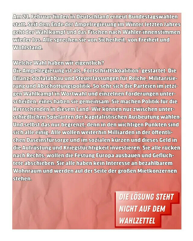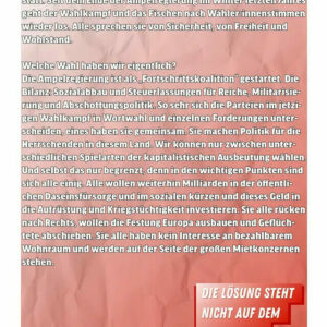 Die Ampelregierung ist als „Fortschrittskoalition“ gestartet. Die Bilanz: Sozialabbau und Steuerlassungen für Reiche, Militarisierung und Abschottungspolitik. So sehr sich die Parteien im jetzigen Wahlkampf in Wortwahl und einzelnen Forderungen unterscheiden, eines haben sie gemeinsam. Sie machen Politik für die Herrschenden in diesem Land. Wir können nur zwischen unterschiedlichen Spielarten der kapitalistischen Ausbeutung wählen. Und selbst das nur begrenzt, denn in den wichtigen Punkten sind sich alle einig. Alle wollen weiterhin Milliarden in der öffentlichen Daseinsfürsorge und im sozialen kürzen und dieses Geld in die Aufrüstung und Kriegstüchtigkeit investieren. Sie alle rücken nach Rechts, wollen die Festung Europa ausbauen und Geflüchtete abschieben. Sie alle haben kein Interesse an bezahlbarem Wohnraum und werden auf der Seite der großen Mietkonzernen stehen.