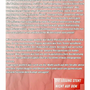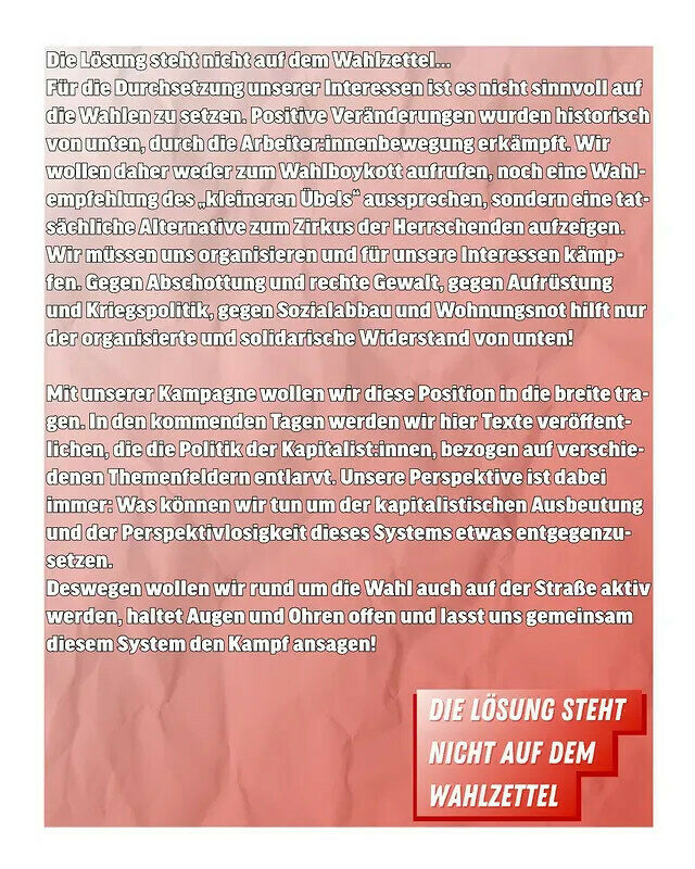 Für die Durchsetzung unserer Interessen ist es nicht sinnvoll auf die Wahlen zu setzen. Positive Veränderungen wurden historisch von unten, durch die Arbeiter:innenbewegung erkämpft. Wir wollen daher weder zum Wahlboykott aufrufen, noch eine Wahlempfehlung des „kleineren Übels“ aussprechen, sondern eine tatsächliche Alternative zum Zirkus der Herrschenden aufzeigen. Wir müssen uns organisieren und für unsere Interessen kämpfen. Gegen Abschottung und rechte Gewalt, gegen Aufrüstung und Kriegspolitik, gegen Sozialabbau und Wohnungsnot hilft nur der organisierte und solidarische Widerstand von unten!
