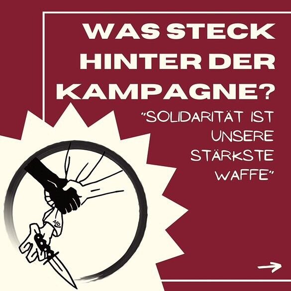 Komm zu unseren Veranstaltungen, unterstützt unsere Kampagne, ob durch das Prägen des Stadtbilds durch unsere Plakate, Broschüren, Sticker und Postkarten, das Teilen unserer Aktionen und Posts, oder in Form von Spenden für unsere selbstfinanzierten Räume und Aktionen.