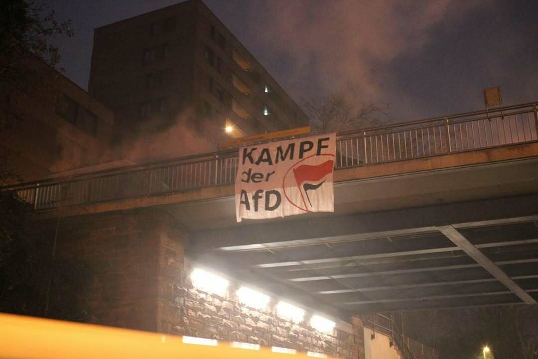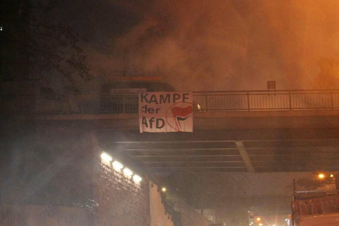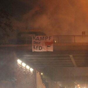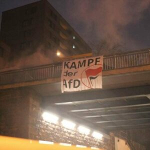 Es scheint, dass Aktivist*innen an einem morgen ein großes Transparent über einer viel befahrenen pforzheimer Straße aufspannten & auch Rauch zündeten. „Kampf der AfD“ steht auf dem Banner, dem können wir nur zustimmen! Es sollte natürlich noch „Kampf der CDU, Grünen & allen anderen Rassisten“ drauf stehen, nichtsdestotrotz ist klar wir müssen aktiv werden & uns zusammen dem Kampf gegen jegliche rechte & menschenfeindliche Positionen stellen! 🚩