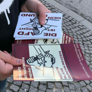 Die AfD und andere rechte Parteien entlarven, über ihre gefährliche Ideologie informieren und linke Alternativen sichtbar machen. Gemeinsam können wir das Stadtbild prägen und dafür sorgen, dass ihr Wahlkampf nicht ohne Widerspruch bleibt!