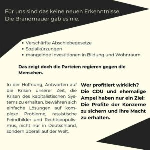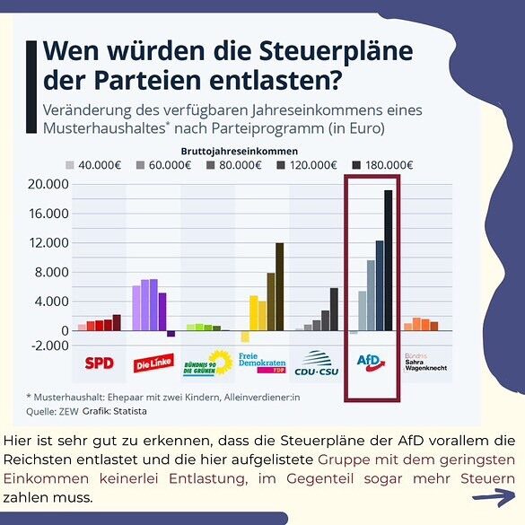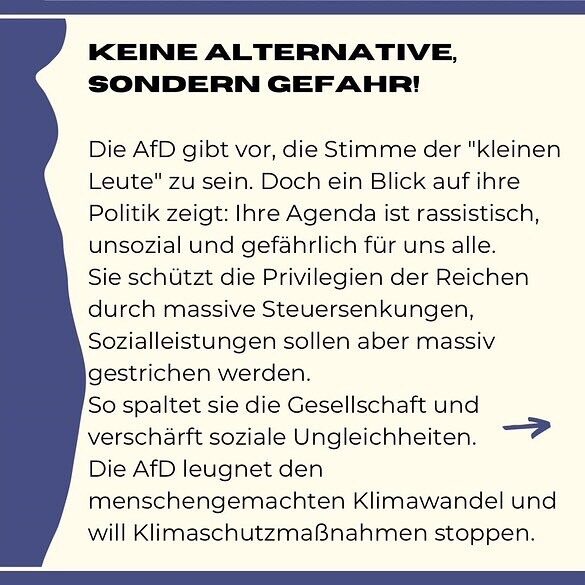 Ihre Hetze gegen Geflüchtete und sozial Schwache lenkt nur davon ab, dass ihre Politik die Reichen schützt und die arbeitende Bevölkerung im Stich lässt. Steuersenkungen für Unternehmen, Sozialkürzungen und das Leugnen der Klimakrise zeigen: Die AfD ist keine Lösung, sondern ein gefährlicher Rückschritt!