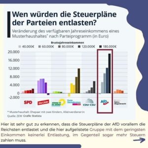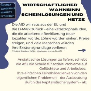 Die AfD gibt vor, die Stimme der „kleinen Leute“ zu sein. Doch ein Blick auf ihre Politik zeigt: Ihre Agenda ist rassistisch, unsozial und gefährlich für uns alle. Sie schützt die Privilegien der Reichen durch massive Steuersenkungen, Sozialleistungen sollen aber massiv gestrichen werden.