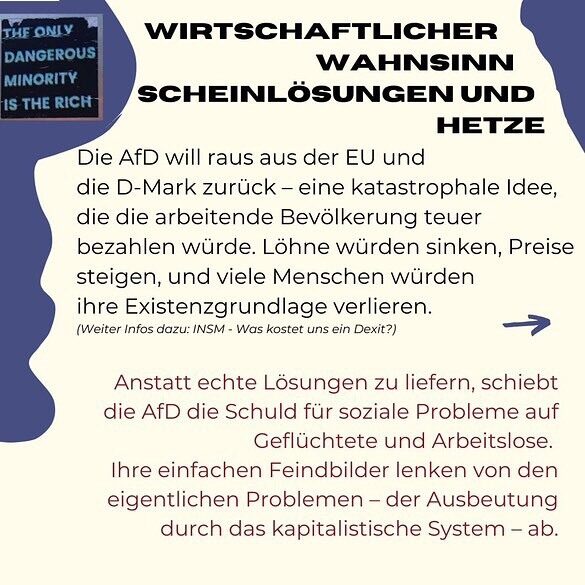 Die AfD will raus aus der EU und die D-Mark zurück – eine katastrophale Idee, die die arbeitende Bevölkerung teuer bezahlen würde. Löhne würden sinken, Preise steigen, und viele Menschen würden ihre Existenzgrundlage verlieren.
