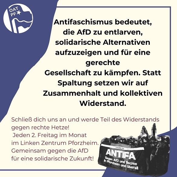 Jeden 2. Freitag im Monat im Linken Zentrum Pforzheim. Gemeinsam gegen die AfD für eine solidarische Zukunft!