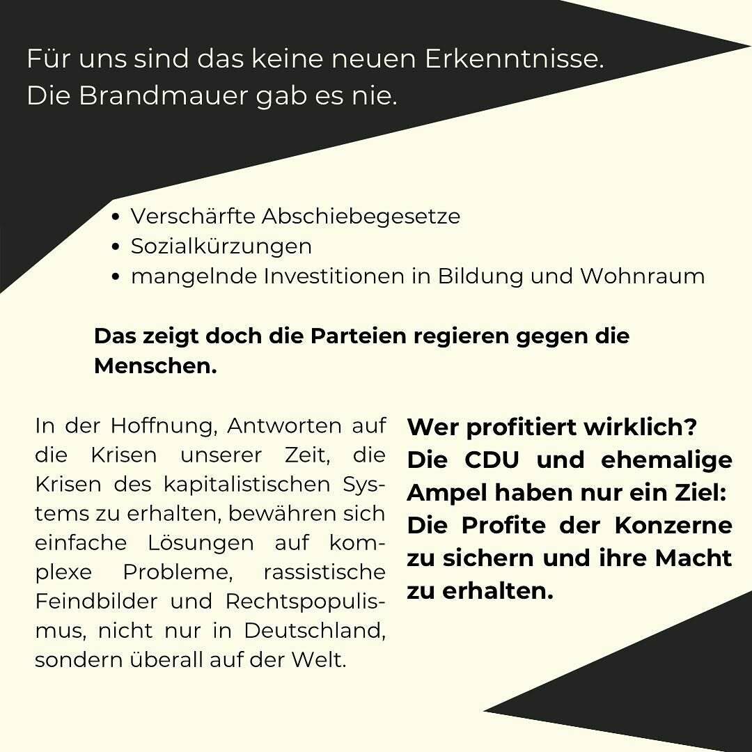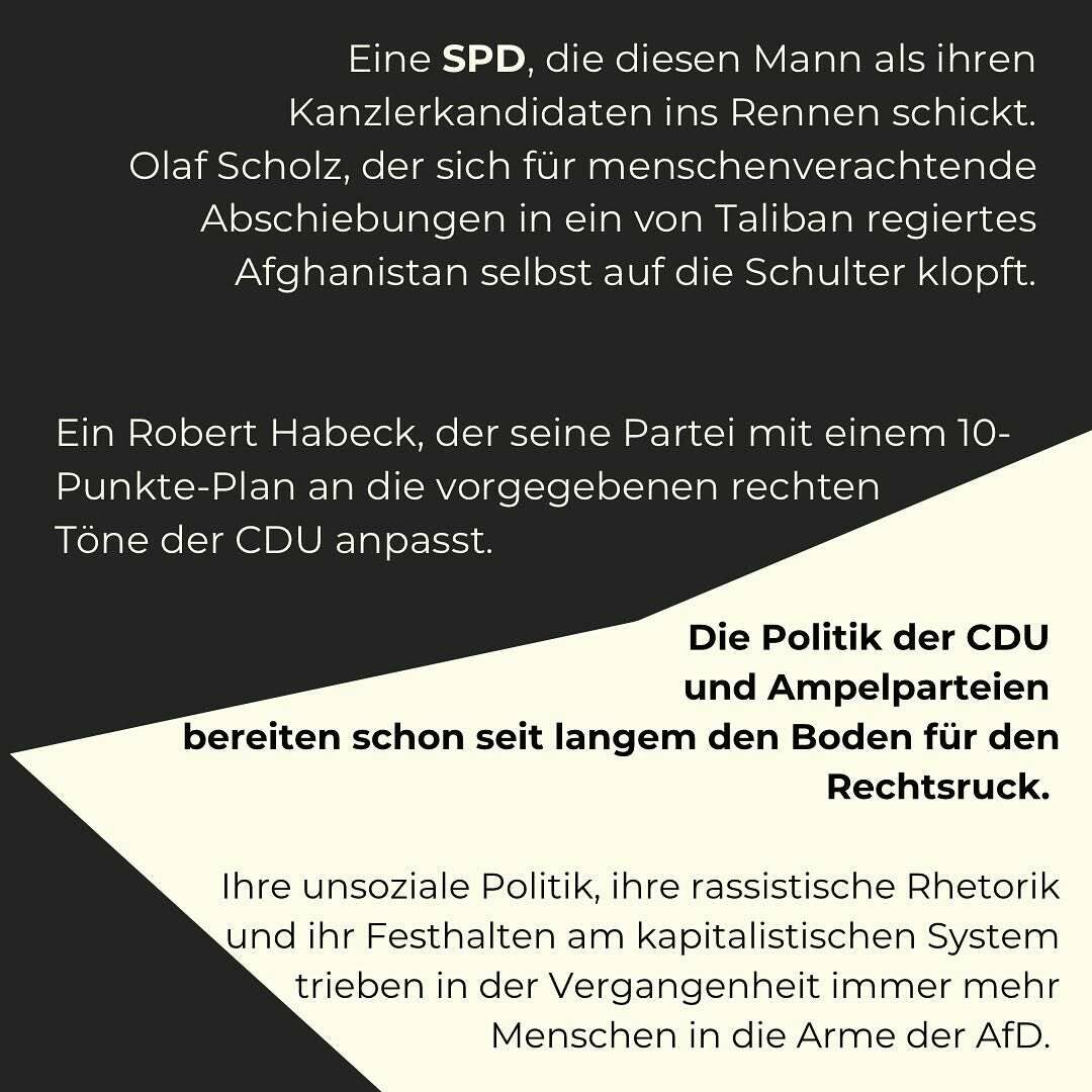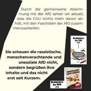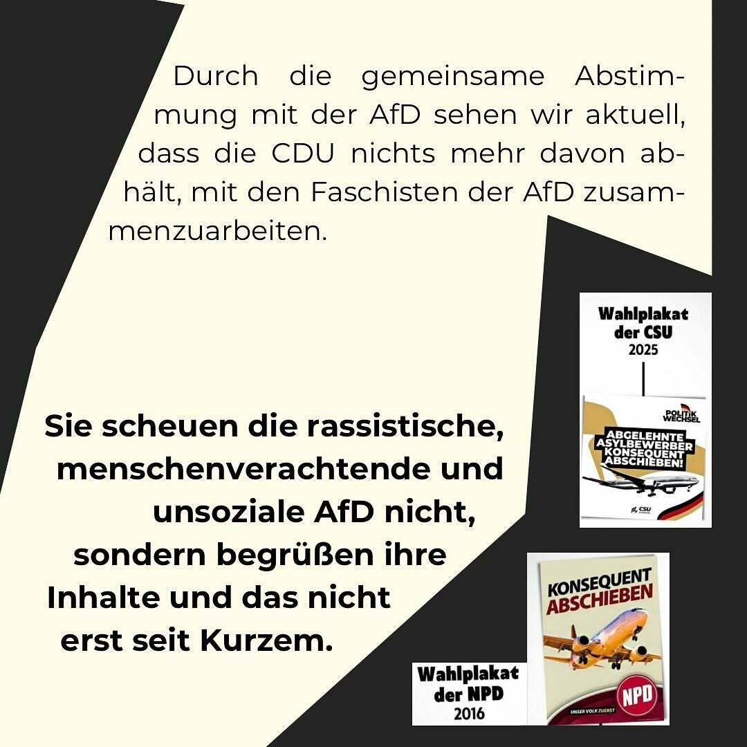 Durch die gemeinsame Abstim- mung mit der AfD sehen wir aktuell, dass die CDU nichts mehr davon abhält, mit den Faschisten der AfD zusammenzuarbeiten.