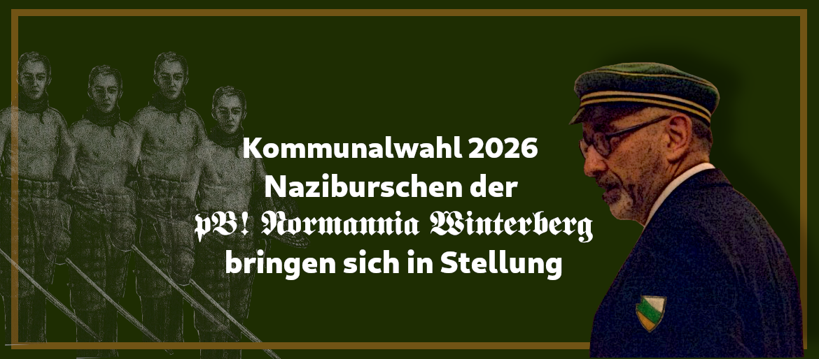 Kommunalwahl 2026: Naziburschen der pB! Normannia Winterberg bringen sich in Stellung Reaktivierung der pB! Normannia Winterberg zu Passau im September 2007 Der Zweck der Schülerverbindung Normannia Winterberg war, nach eigenem Verständnis, schon immer die aktive Unterstützung der Volkstumsarbeit. Weiterhin die Befähigung und Förderung der Bundesbrüder zur gesellschaftlichen bzw. politischen Betätigung und Formung der Gesellschaft nach den Werten der Verbindung. Die Ausrichtung der Schülerschaft war daher schon immer nicht nur klar politisch und ideologisch geleitet, sondern auch mit dem Auftrag verbunden, geeignet erscheinende deutsche Jungs und Männer zu sammeln, charakterlich zu erziehen, inhaltlich zu bilden und in entsprechende Ämter und Positionen zu verhelfen. Diesem Vorhaben verschrieb sich die pB! Normannia Winterberg nicht […]