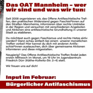 Auch im Februar findet wieder unser Offenes Antifaschistisches Treffen im JUZ statt. Ab 18:30 Uhr könnt ihr vorbeischauen und bei einem Getränk mit uns ins Gespräch kommen. Um 19 Uhr beginnt unser Treffen. Wie jeden Monat wollen wir mit euch zu aktuellen Antifa-Themen in den Austausch kommen und über geplante Demos und Aktionen im Februar informieren. Schaut mal vorbei und bringt eure Freund*innen mit, wir freuen uns auf euch!