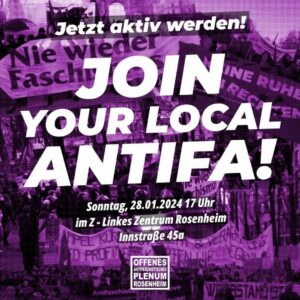 Wenn ihr aus Rosenheim und Region kommt, bietet das Offene Antifaschistische Plenum eine Möglichkeit dazu, sich mit anderen Aktivist*innen zu vernetzen. Wenn ihr also Lust habt, mit uns Proteste gegen die AfD zu organisieren, antikapitalistisch zu Fridays for Future Demos aufzurufen, und für soziale Gerechtigkeit zu kämpfen, kommt vorbei! Wir freuen uns immer über neue Gesichter und neue Ideen!