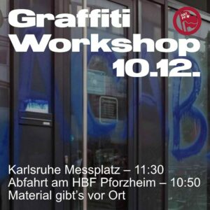 Wir wollen allen ermöglichen sich etwas Erfahrung mit der Sprühdose anzueignen. Material haben wir da, trotzdem könnt ihr gerne euer eigenes mitbringen! Anschließend würden wir gerne zusammen ein größeres Piece malen. Kommt vorbei, zieht euch warm an und bring eure Freund*innen mit. Der Workshop wird in Karlsruhe auf dem Messplatz stattfinden, dafür treffen wir uns um 10:50 am HBF Pforzheim. Ihr könnt auch gerne später dazukommen.
