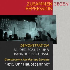 Für Silvester 2023 rufen mehrere antifaschistische, linke und revolutionäre Gruppen zu einer Demonstration am Bruchsaler Knast auf, an der wir uns beteiligen wollen.