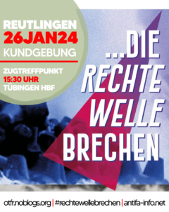 Deshalb fahren wir am Freitag, den 26.01. mit dem Bündnis gegen Rechts nach Reutlingen auf die breite Kundgebung gegen die AfD. Dafür treffen wir uns um 15:30 Uhr am Tübinger Hauptbahnof.
