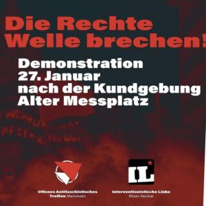 Am 27.01. findet um 16 Uhr unter dem Motto „Nie wieder ist jetzt“ eine Kundgebung von Mannheim sagt Ja auf dem Alten Messplatz statt. Im Anschluss rufen wir dazu auf euch der Anschlussdemostration der Interventionistischen Linken und des OATs anzuschließen!