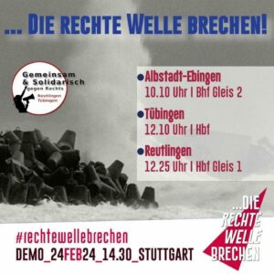 Auch wir als Bündnis ‚Gemeinsam & Solidarisch gegen Rechts‘ sind dabei, wenn es am 24.02. heißt: „Die rechte Welle rollt – Zeit, sie zu brechen“! Schließt euch unserem Zugtreffpunkt in Reutlingen um 12:25 Uhr, Hbf Gleis 1 an oder kommt schon in Tübingen (12:10 Uhr Hbf) oder in Albstadt-Ebingen (10:10, Bhf Gleis 2) dazu!