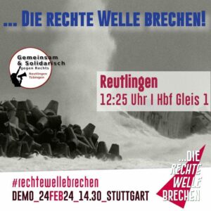 Auch wir als Bündnis ‚Gemeinsam & Solidarisch gegen Rechts‘ sind dabei, wenn es am 24.02. heißt: „Die rechte Welle rollt – Zeit, sie zu brechen“! Schließt euch unserem Zugtreffpunkt in Reutlingen um 12:25 Uhr, Hbf Gleis 1 an oder kommt schon in Tübingen (12:10 Uhr Hbf) oder in Albstadt-Ebingen (10:10, Bhf Gleis 2) dazu!