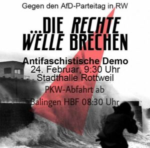 Wir rufen dazu auf, der AfD das Leben schwer zu machen. Jeder Auftritt, ob öffentlich oder nicht-öffentlich, muss mit konsequentem Gegenprotest beantwortet werden. Deswegen wollen wir am 24. Februar 2024 aus dem Zollernalbkreis nach Rottweil. Hier will die AfD in der Stadthalle am 24. und 25. Februar einen Sonderparteitag abhalten. Der wurde organisiert, weil der Südwest-Landesverband mal wieder zerstritten ist. Wir möchten der AfD aber keine Chance bieten ihre Streitereien in Ruhe beizulegen.
