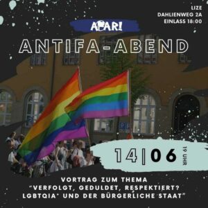 Am Freitag heißt es wieder Antifa-Abend! Und anlässlich des Pride-Months gibt es dieses mal einen Vortrag zum Thema „verfolgt, geduldet, respektiert? LGBTQIA* und der bürgerliche Staat“