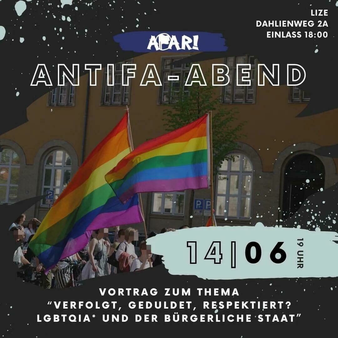 Am Freitag heißt es wieder Antifa-Abend! Und anlässlich des Pride-Months gibt es dieses mal einen Vortrag zum Thema „verfolgt, geduldet, respektiert? LGBTQIA* und der bürgerliche Staat“