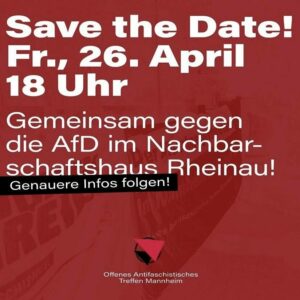 Die AfD plant für den 26. April eine weitere Veranstaltung im Nachbarschaftshaus in Mannheim-Rheinau! Wir sind schon fleißog an der Planung der gegenproteste. Haltet euch den Freitagabend frei und achtet auf Ankündigungen in den nächsten Wochen!