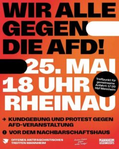 Am 25.05. veranstaltet die AfD Mannheim erneut einen sogenannten „Bürgerdialog“ im Nachbarschaftshaus Rheinau. Als Referierende ist wieder hochkarätiges AfD-Personal von der Bundesebene zu erwarten.