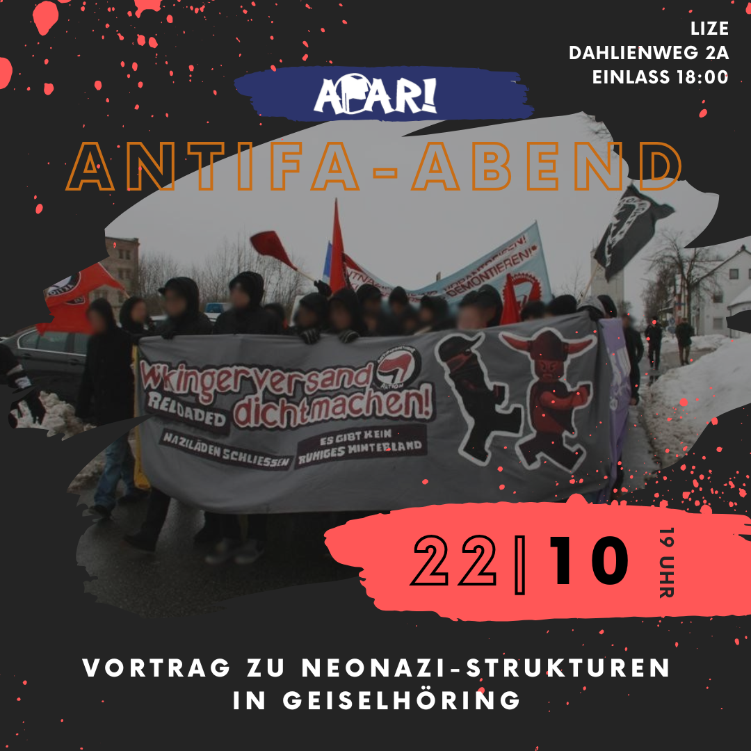 Am 22. Oktober (Dienstag) heißt es wieder Antifa-Abend! Anlässlich einer antifaschistischen Demonstration in Geiselhöring (Nähe Straubing) am 26. Oktober wollen wir uns anschauen, wie die dortigen Neonazistrukturen aufgestellt sind. Im Fokus stehen der „Wikingerversand“, die verbotenen Netzwerke „Hammerskins“ und „Blood & Honour“ sowie die lokale Rockerszene. Außerdem wollen wir diskutieren, was Ansatzpunkte für eine nachhaltige antifaschistische Arbeit vor Ort sein könnten.