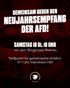 Am 18.01.2025 findet der Neujahrsempfang der AfD Mannheim statt. Die rechtsradikale Partei hat erneut den Bürgersaal auf der Rheinau gewählt, um sich dort kurz vor der Bundestagswahl als bürgernah zu inszenieren und ihre menschenverachtenden Ansichten zu verbreiten.