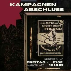 Am Freitag den 17.02 veranstalten wir, das OAT Pforzheim, zum Abschluss unsere Kampagne „Rechte Pläne durchkreuzen, Solidarität ist unsere stärkste Waffe“ eine Kundgebung auf dem Marktplatz in Pforzheim. Start wird um 18 Uhr sein. Kommt vorbei, schließt euch uns an, wer schweigt stimmt zu!