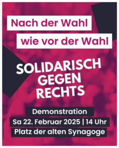 Am 22. Februar 2025 – einen Tag vor der Wahl – gehen wir auf die Straße, um uns geschlossen und entschlossen gegen Rechts zu stellen.