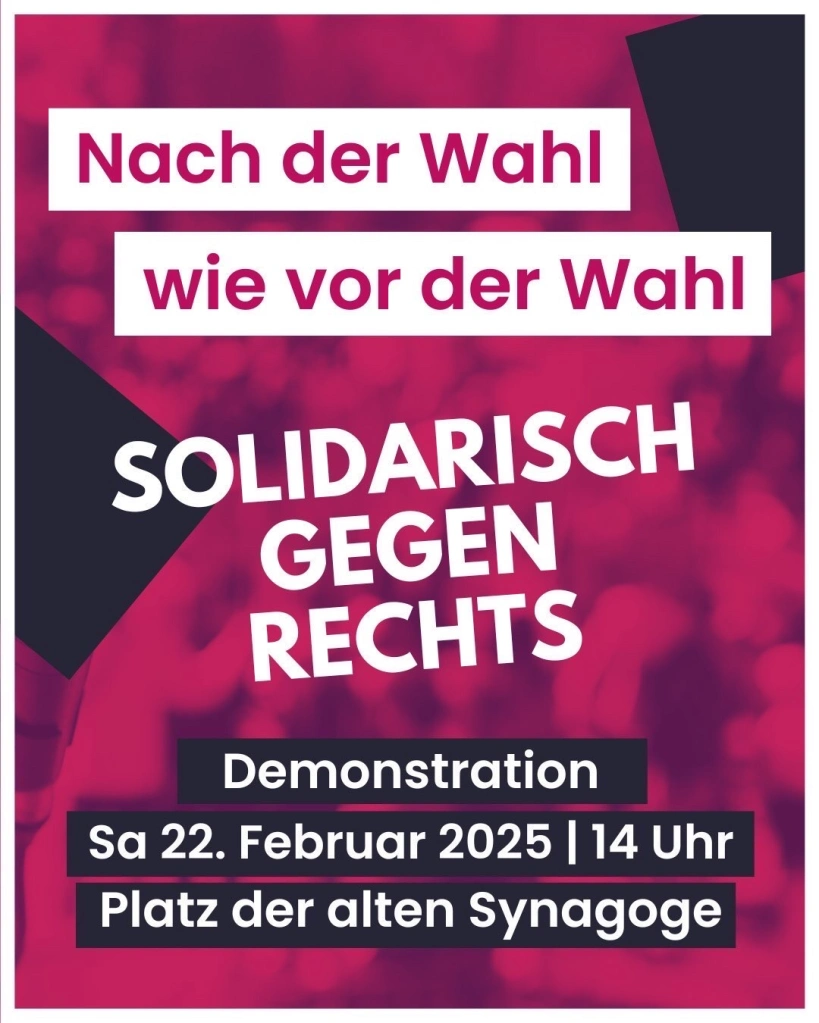 Wann? Am 22. Februar 2025 um 14:00 Uhr Wo? Platz der alten Synagoge