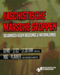 feb 17 Faschistische Märsche stoppen DemonstrationNürnberg Mehr Infos Am 17. Februar 2025 um 17:30 UhrPlärrer (Ecke Gostenhofer Hauptstraße)Antifa-Aktionskneipe NürnbergGefunden auf instagram.com Am Montag auf die Straße gegen den faschistischen Aufmarsch von „Team Menschenrechte“. Kein Platz für Faschos in unserer Stadt! 17:30 Uhr Plärrer – seid pünktlich! Wann? Am 17. Februar 2025 um 17:30 Uhr Wo? Plärrer (Ecke Gostenhofer Hauptstraße)