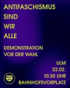 Kommt mit uns gemeinsam am 22.02.2025 in Ulm auf die Straße um gemeinsam für einen vielfältigen und langfristigen Antifaschismus zu stehen. Die Demoroute führt an den AfD-Infoständen in Ulm und Neu-Ulm entlang. Lasst uns gemeinsam laut sein, denn eins ist klar: Wir sind nicht allein und wir sind mehr.