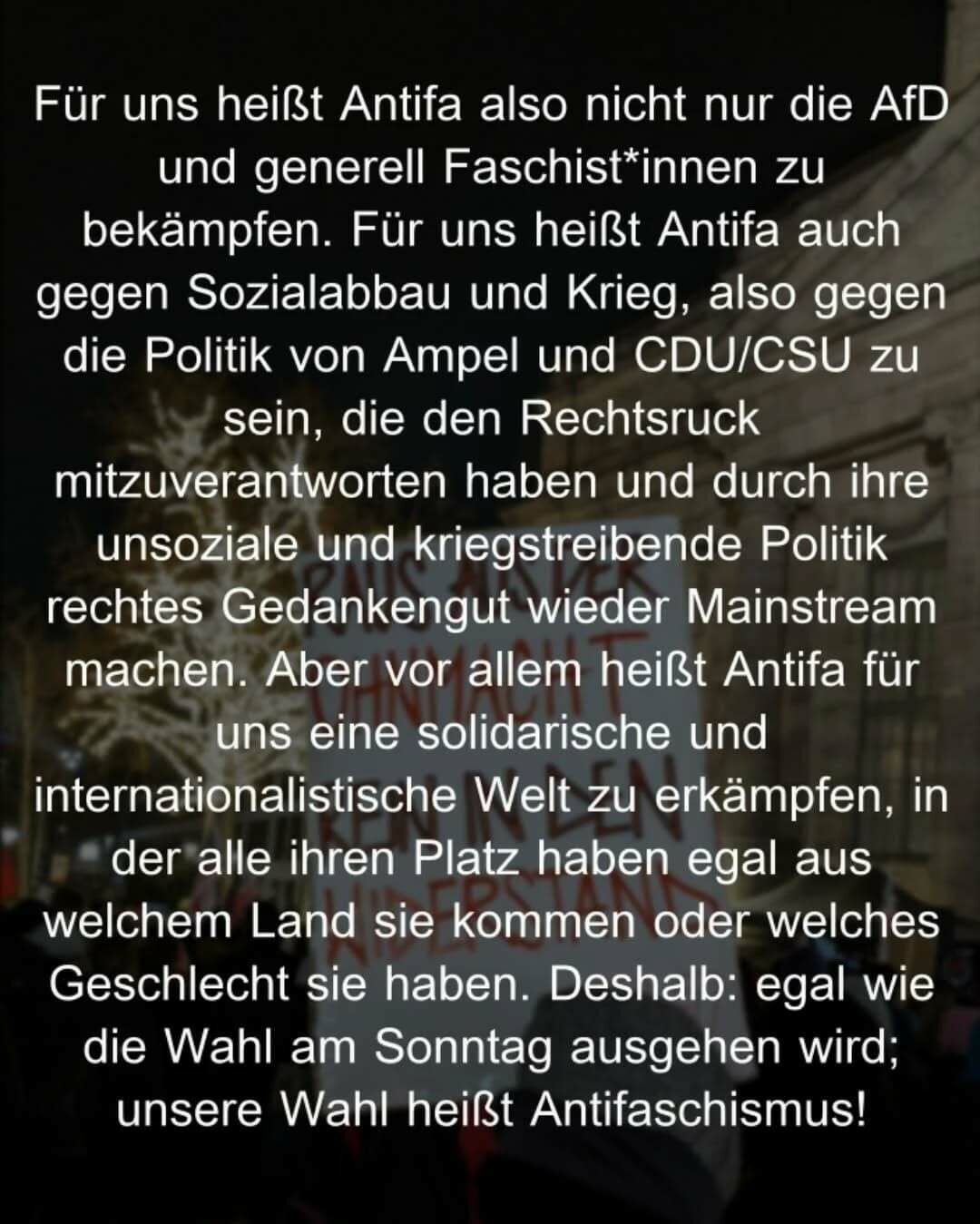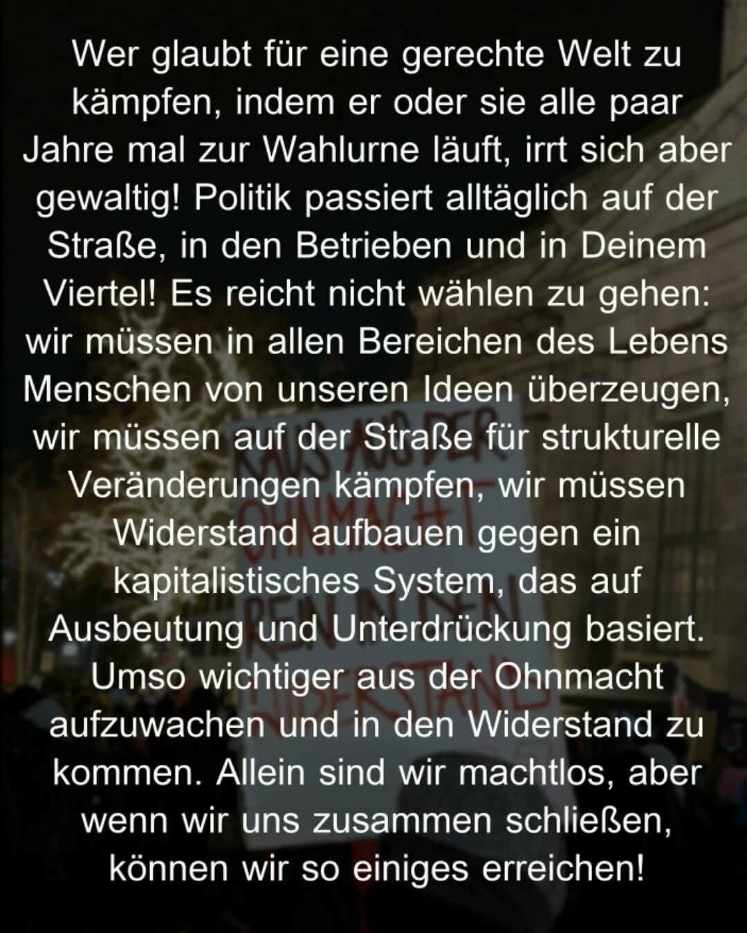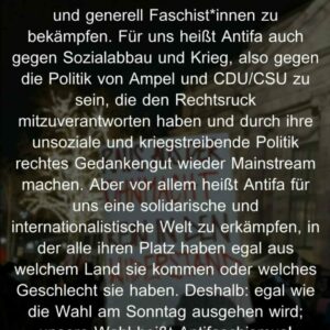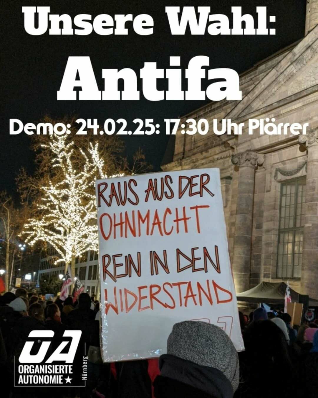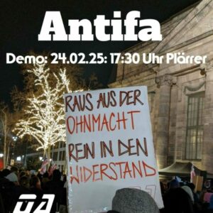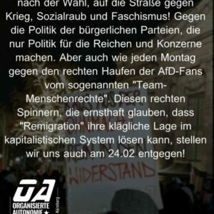 Am Montag auf die Straße – unsere Wahl: Antifa! Kommt mit uns und lasst die Ohnmacht hinter euch, die man angesichts des Rechtsrucks spürt. Kommen wir zusammen in Aktion, leben wir den Widerstand!