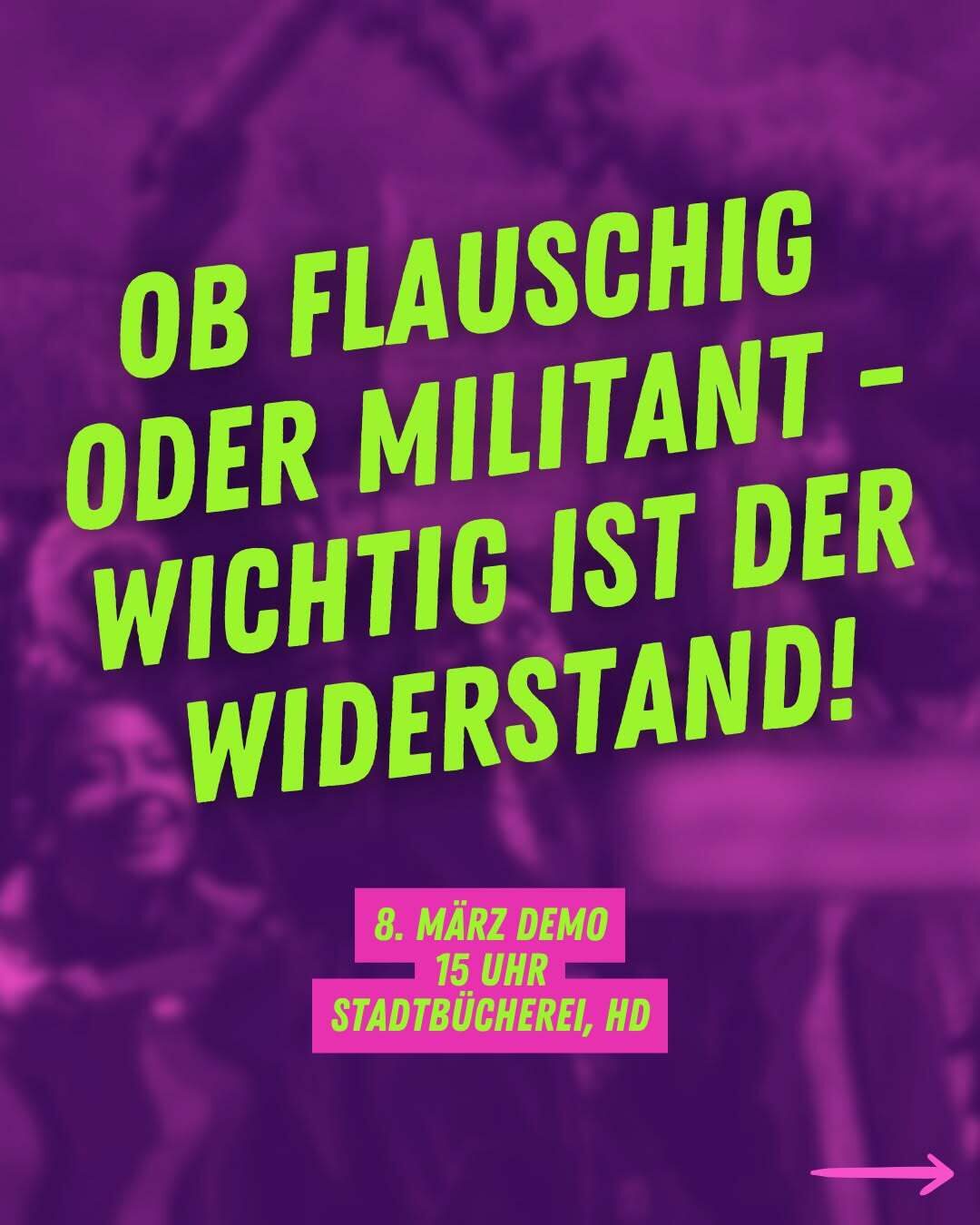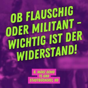 Dieses Jahr gehen wir am 8. März mit dem Motto „Ob flauschig oder militant – wichtig ist der Widerstand!“ auf die Straße.