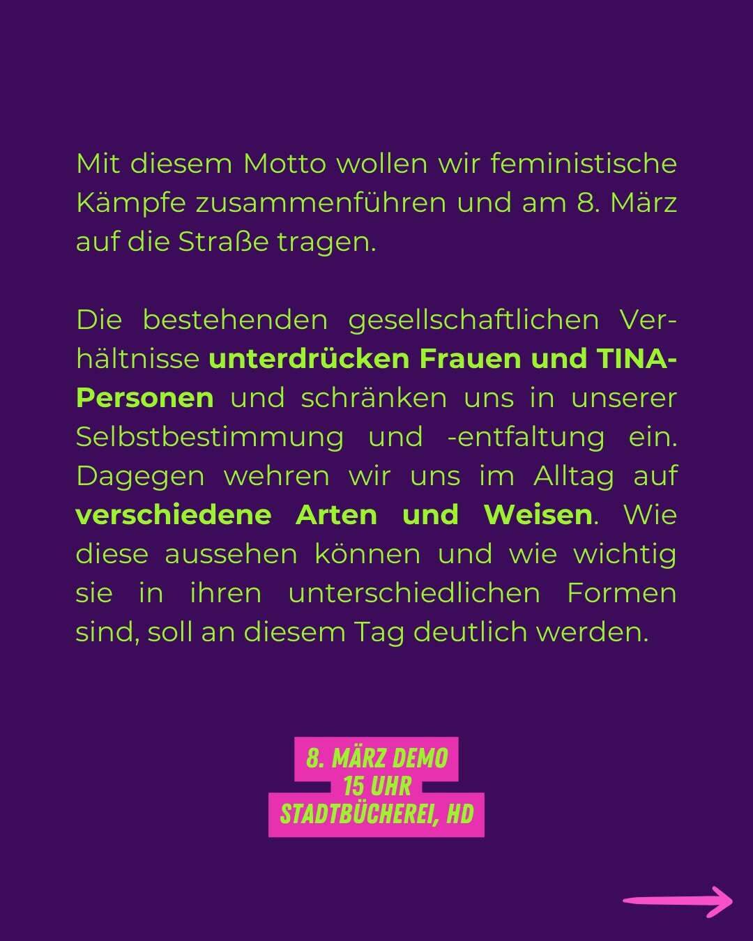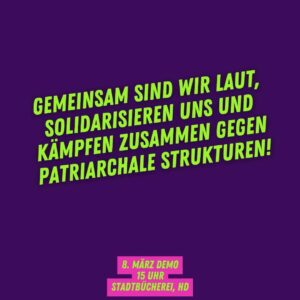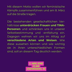 Frauen und TINA-Personen werden in den bestehenden gesellschaftlichen Verhältnissen unterdrückt. Dagegen wehren wir uns auf unterschiedliche Arten und Weisen. Welche Formen der feministische Widerstand annehmen kann, möchten wir mit den verschiedenen Redebeiträgen deutlich machen. Es wird um gelebte solidarische Praxis, feministische Utopien und Kämpfe gehen und es wird aufgezeigt werden, wie wir uns als FLINTA organisieren und füreinander da sein können.