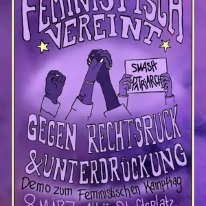 Der 8. März ist der internationale feministische Kampftag – ein Tag, um laut und sichtbar gegen Unterdrückung, Diskriminierung und patriarchale Strukturen zu kämpfen. Rechte Ideologien greifen unsere Rechte an und drängen weltweit FLINTA* (Frauen, Lesben, Inter, Nicht-binäre, Trans und Agender) in traditionelle Geschlechterrollen zurück. Unsere Selbstbestimmung wird bedroht – wir sagen: Nein! Die Fakten sind alarmierend: