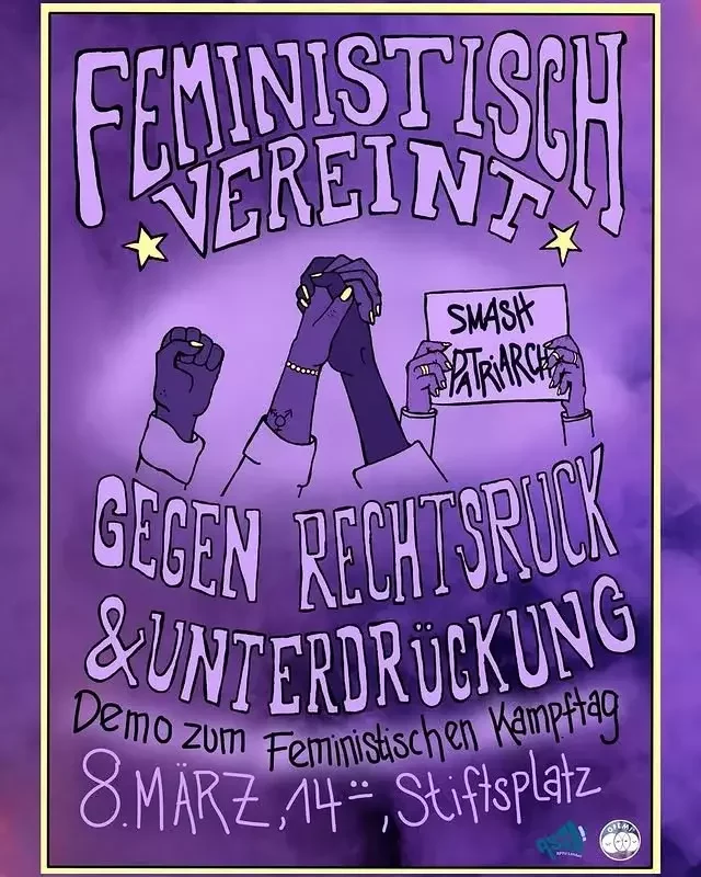 Lasst uns laut, entschlossen und solidarisch sein! Gemeinsam stehen wir feministisch vereint gegen neoliberale konservative Politik, Rechtsruck und Unterdrückung.