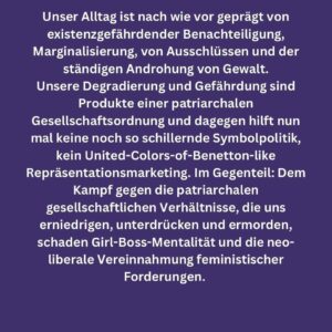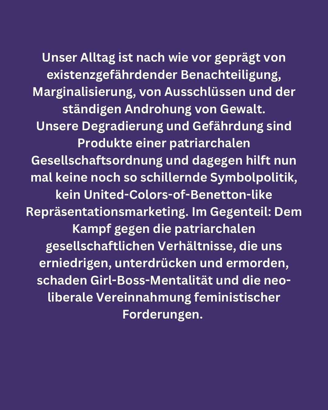 Unsere Degradierung und Gefährdung sind Produkte einer patriarchalen Gesellschaftsordnung und dagegen hilft nun mal keine noch so schillernde Symbolpolitik, kein United-Colors-of-Benetton-like Repräsentationsmarketing. Im Gegenteil: Dem Kampf gegen die patriarchalen gesellschaftlichen Verhältnisse, die uns erniedrigen, unterdrücken und ermorden, schaden Girl-Boss-Mentalität und die neo-liberale Vereinnahmung feministischer Forderungen.