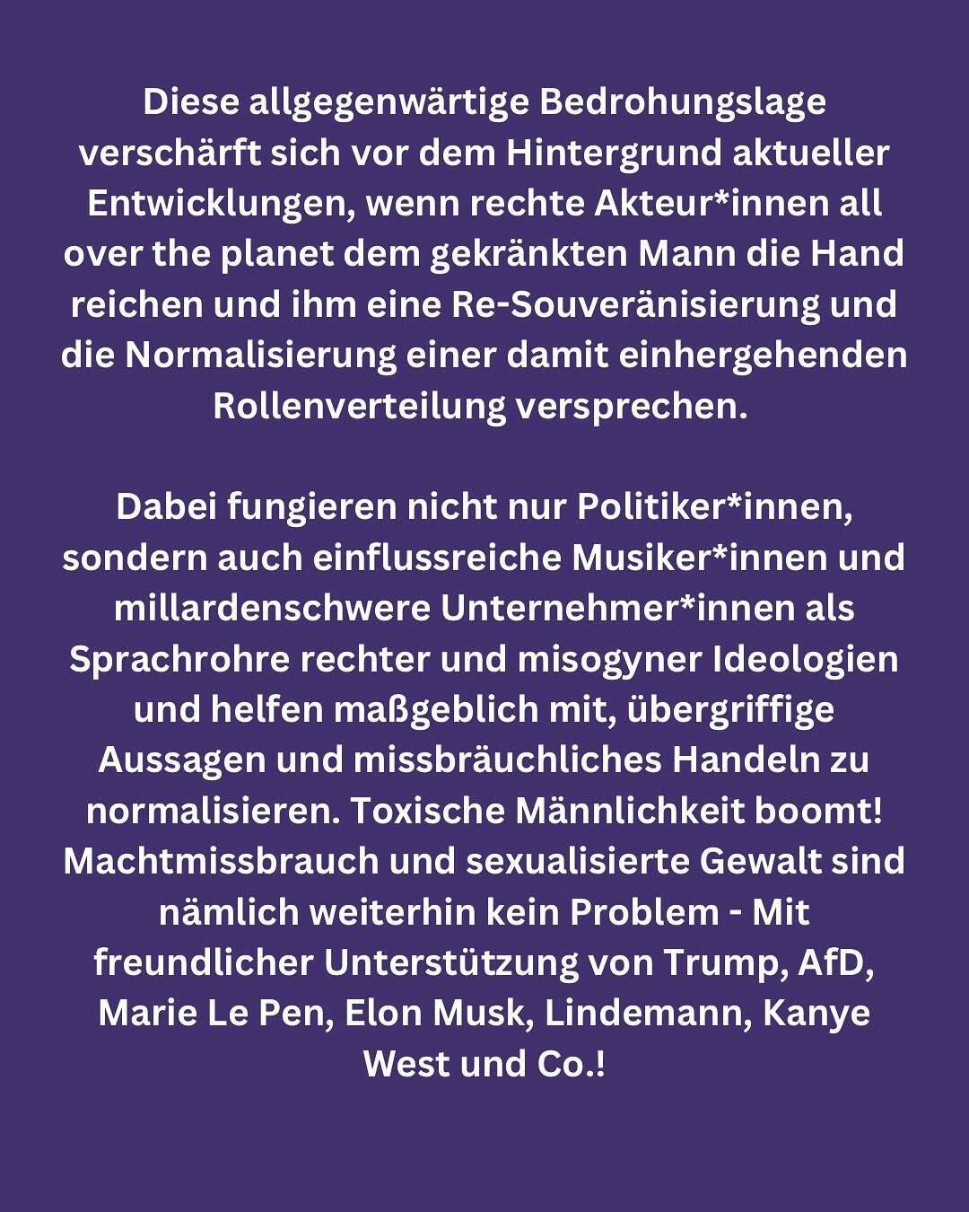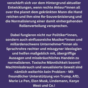 Diese allgegenwärtige Bedrohungslage verschärft sich vor dem Hintergrund aktueller Entwicklungen, wenn rechte Akteur*innen all over the planet dem gekränkten Mann die Hand reichen und ihm eine Re-Souveränisierung und die Normalisierung einer damit einhergehenden Rollenverteilung versprechen.