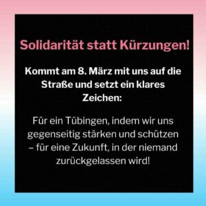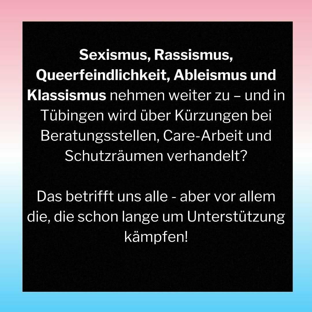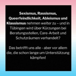 Sexismus, Rassismus, Queerfeindlichkeit, Ableismus und Klassismus nehmen weiter zu – und in Tübingen wird über Kürzungen bei Beratungsstellen, Care-Arbeit und Schutzräumen verhandelt?