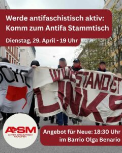 Also kommt vorbei beim nächsten Antifaschistischen Stammtisch München! Lernen wir uns kennen, informieren wir uns, diskutieren wir und bringen wir den Antifaschismus in die Offensive!