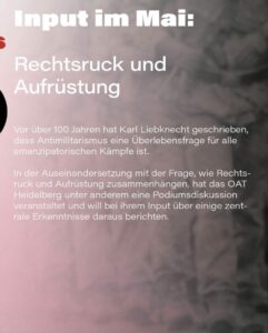 In der Auseinandersetzung mit der Frage, wie Rechtsruck und Aufrüstung zusammenhängen, hat das OAT Heidelberg unter anderem eine Podiumsdiskussion veranstaltet und will bei ihrem Input über einige zentrale Erkenntinisse daraus berichten.