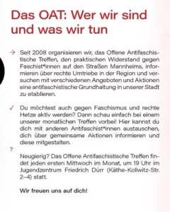 Das Offene Antifaschistische Treffen Mannheim will über Naziaktivitäten in der Region informieren und eine gemeinsame antifaschistische Praxis gegen diese Umtriebe entwickeln. Darüber hinaus will das OAT rassistische und rechtspopulistische Denkmuster in der Gesellschaft erkennen und die breite Öffentlichkeit für diese Themen sensibilisieren.